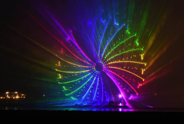 激光水幕采用特殊的投影机播放,使用的影片也是专门为水幕电影特制的影带。由于电影的屏幕是透明的水膜,因此在电影播放时会有一种特殊的光学效果,屏幕的视觉穿透性可使画面具有一种立体的感觉,影片的内容可与水面巧妙的结合,更有一种身临其境般的奇幻感觉。水幕电影是通过高压水泵和特制水幕发生器,将水自下而上,高速喷出,雾化后形成扇形“银幕”,由专用放映机将特制的录影带投射在“银幕”上,形成水幕电影。当观众在观摩电影时,扇形水幕与自然夜空融为一体,当人物出入画面时,好似人物腾起飞向天空或自天而降,产生一种虚无缥缈和梦幻的感觉,令人神往。其控制方法有:编程控制、直接控制和实用程序控制,水幕电影影视效果奇特、新颖并是较佳的广告宣传工具,各种广场及宽阔的水面均可按装水幕电影。