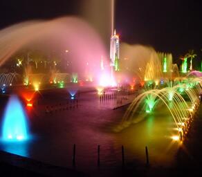 利用播放或现场演奏音乐信号控制喷泉和灯光的喷泉。根据专用的音乐喷泉控制系统使喷水造型变化和灯光的变化随音乐的节奏、旋律的起伏变化而变化,美妙绝伦,同步率可达到±0.02秒,既可以为实时控制,编辑控制,又可以为电脑智能控制。 用户可以在编辑界面编写自己喜爱的音乐程序。播放系统可以实现音乐、水、灯光气氛统一,同步播放。